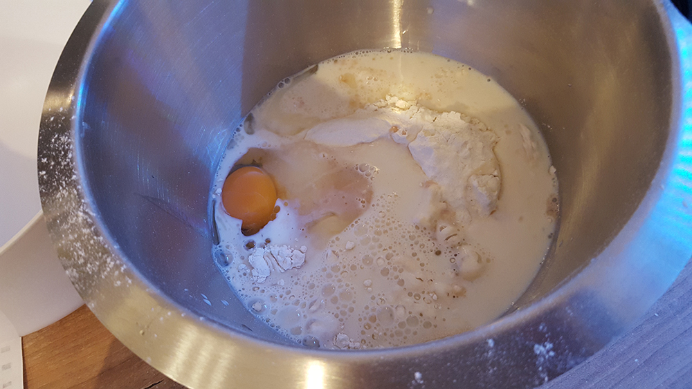4. Den Germ und die Milch zu den restlichen Zutaten in die Schüssel geben