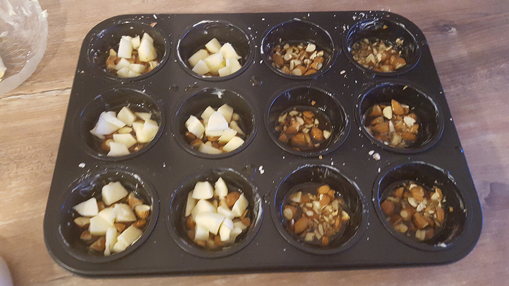 12. Die Stücke in die Muffinform geben und noch etwa 10 Minuten stehen lassenDie Butter-Zucker-Honig Masse auf den Boden der Muffinform geben.